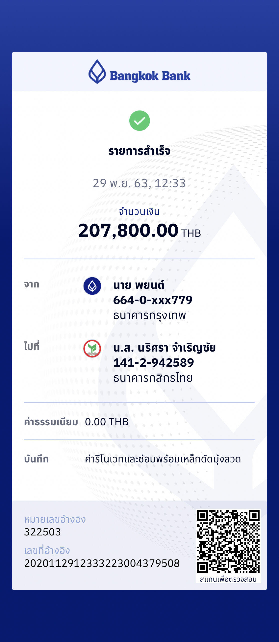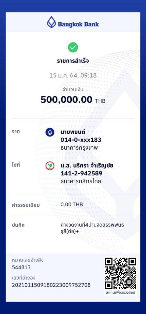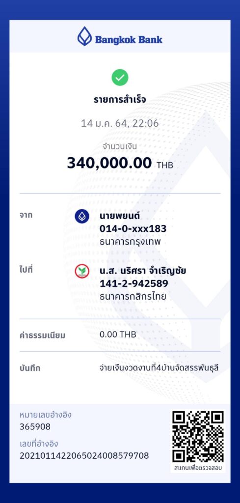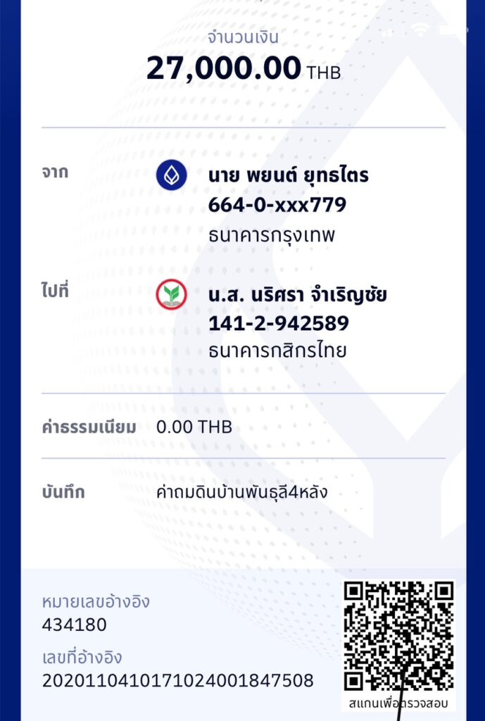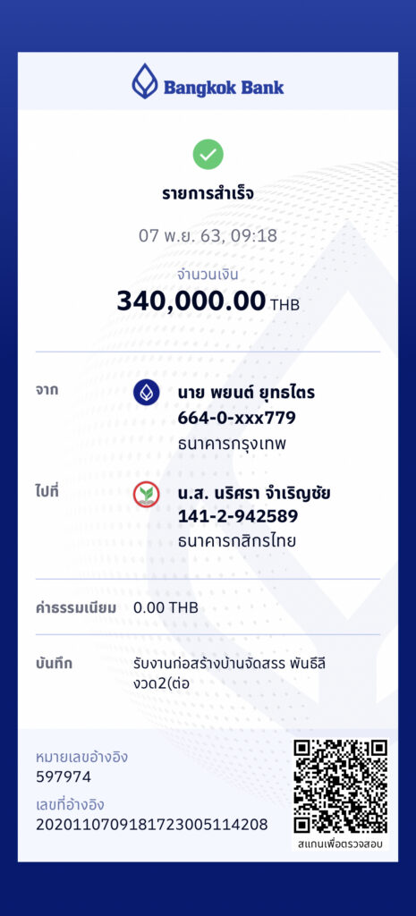 บ้านจัดสรร โครงการเฟส 2 วันที่ 14 ธันวาคม 2563 – จ่ายเงินค่าก่อสร้างงวดที่ 3 ผู้รับเหมาขอเบิกเงินค่าก่อนสร้าง งวดที่ 3 – งานเทพื้น หล่อเสา วางระบบสุขาภิบาล โครงหลังคา เบิก 20% = 840,000 บาท โอนเงินไป 850,000 บาท เกินไป 10,000 บาท ทางผู้รับเหมาจึงโอนคืนกลับมาให้ By admin, 5 ปีธันวาคม 14, 2020 ago